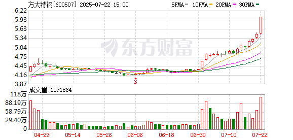 方大特钢(600507)今日涨停,全天换手率4.72%,成交额6.31亿元,振幅10.68%。龙虎榜数据显示,机构净买入1.63亿元,沪股通净买入385.34万元,营业部席位合计净卖出39.24万元。