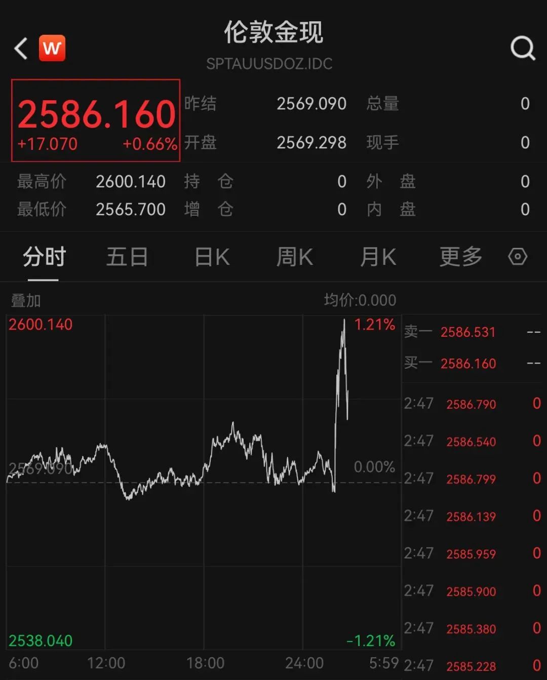 利率决议公布后,现货黄金迅速拉升,一度涨破2590美元/盎司,刷新最高纪录,随后亦大幅跳水,由涨转跌,截至凌晨4点左右,日内跌0.38%,报2559.76美元/盎司。